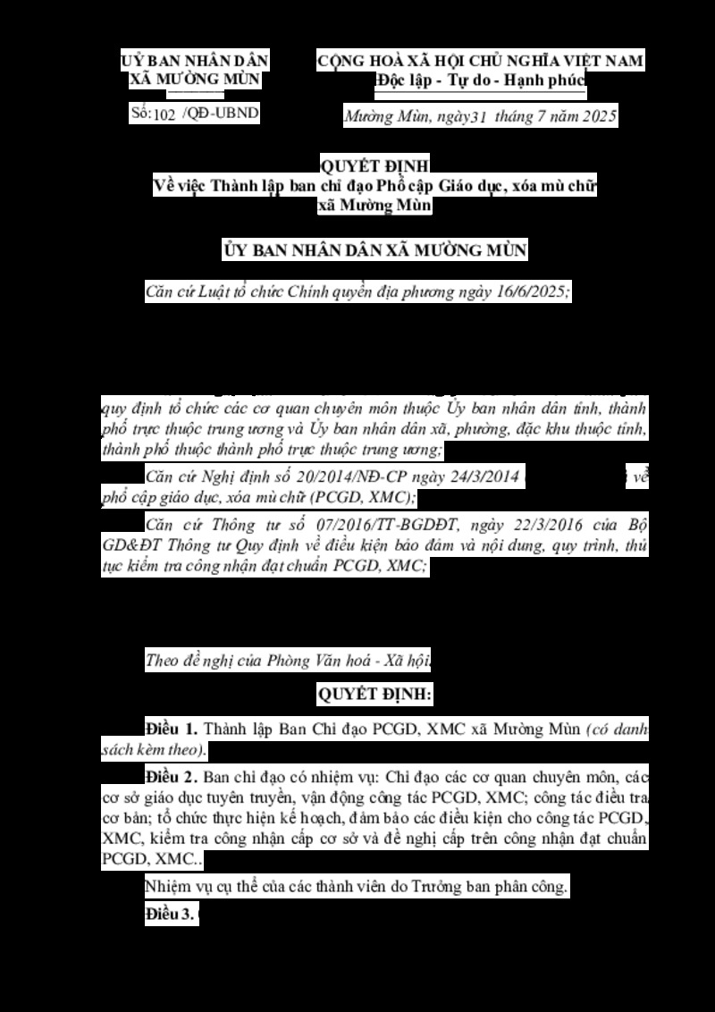 | Tiêu đề văn bản | Quyết định về việc Thành lập ban chỉ đạo Phổ cập Giáo dục, xóa mù chữ xã Mường Mùn | ||