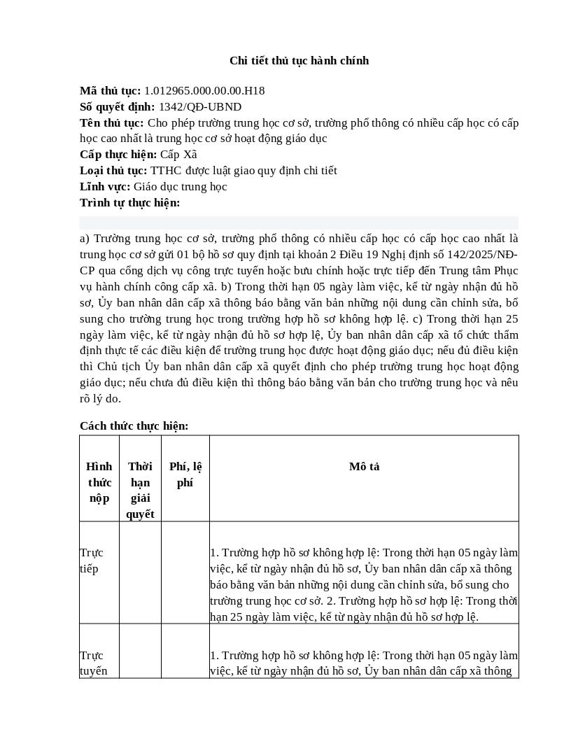 Thành phần hồ sơBao gồm Trình tự thực hiệna) Trường trung học cơ sở, trường phổ thông có nhiều cấp học có cấp học cao nhất là trung học cơ sở gửi 01 bộ hồ sơ quy định tại khoản 2 Điều 19 Nghị định số 142/2025/NĐ-CP qua cổng dịch vụ công trực tuyến hoặc bưu chính hoặc trực tiếp đến Trung tâm Phục vụ hành chính công cấp xã. b) Trong thời hạn 05 ngày làm việc, kể từ ngày nhận đủ hồ sơ, Ủy ban nhân dân cấp xã thông báo bằng văn bản những nội dung cần chỉnh sửa, bổ sung cho trường trung học trong trường hợp hồ sơ không hợp lệ. c) Trong thời hạn 25 ngày làm việc, kể từ ngày nhận đủ hồ sơ hợp lệ, Ủy ban nhân dân cấp xã tổ chức thẩm định thực tế các điều kiện để trường trung học được hoạt động giáo dục; nếu đủ điều kiện thì Chủ tịch Ủy ban nhân dân cấp xã quyết định cho phép trường trung học hoạt động giáo dục; nếu chưa đủ điều kiện thì thông báo bằng văn bản cho trường trung học và nêu rõ lý do. | ||||||||||||||||||