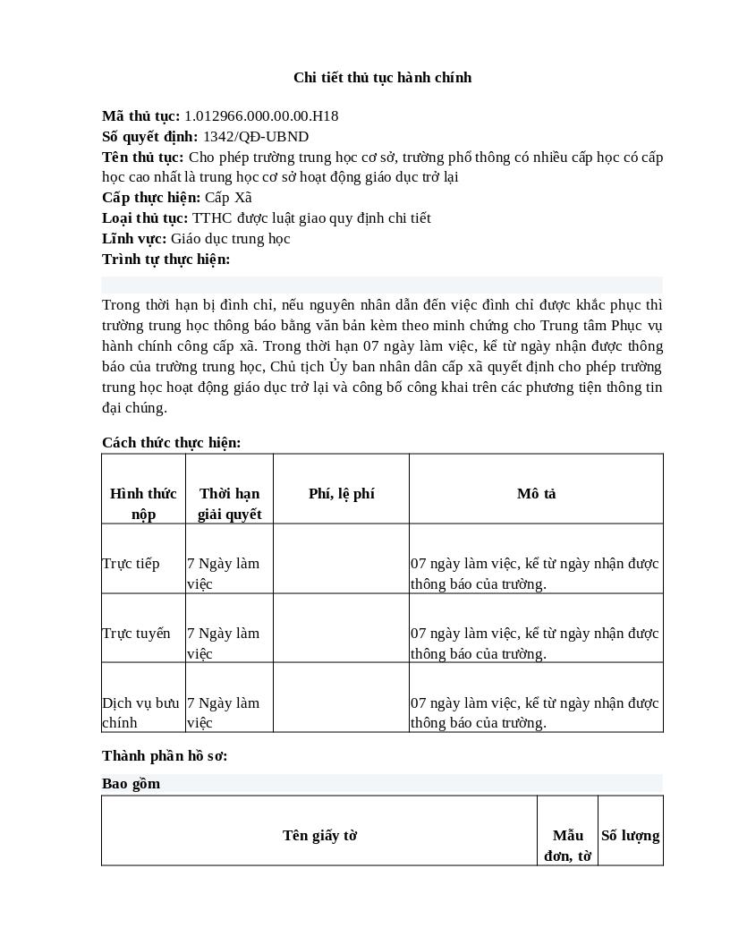 Thành phần hồ sơBao gồm Trình tự thực hiệnTrong thời hạn bị đình chỉ, nếu nguyên nhân dẫn đến việc đình chỉ được khắc phục thì trường trung học thông báo bằng văn bản kèm theo minh chứng cho Trung tâm Phục vụ hành chính công cấp xã. Trong thời hạn 07 ngày làm việc, kể từ ngày nhận được thông báo của trường trung học, Chủ tịch Ủy ban nhân dân cấp xã quyết định cho phép trường trung học hoạt động giáo dục trở lại và công bố công khai trên các phương tiện thông tin đại chúng. | ||||||||||||||||||