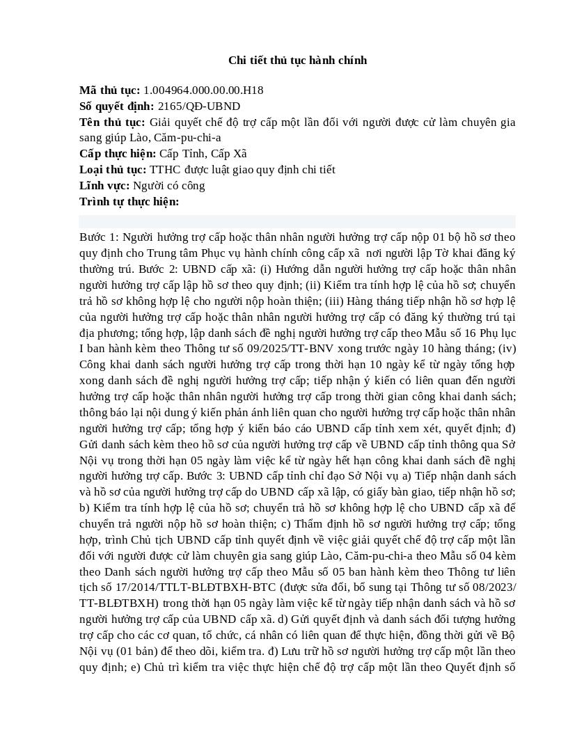 Thành phần hồ sơBao gồm Trình tự thực hiệnBước 1: Người hưởng trợ cấp hoặc thân nhân người hưởng trợ cấp nộp 01 bộ hồ sơ theo quy định cho Trung tâm Phục vụ hành chính công cấp xã nơi người lập Tờ khai đăng ký thường trú. Bước 2: UBND cấp xã: (i) Hướng dẫn người hưởng trợ cấp hoặc thân nhân người hưởng trợ cấp lập hồ sơ theo quy định; (ii) Kiểm tra tính hợp lệ của hồ sơ; chuyển trả hồ sơ không hợp lệ cho người nộp hoàn thiện; (iii) Hàng tháng tiếp nhận hồ sơ hợp lệ của người hưởng trợ cấp hoặc thân nhân người hưởng trợ cấp có đăng ký thường trú tại địa phương; tổng hợp, lập danh sách đề nghị người hưởng trợ cấp theo Mẫu số 16 Phụ lục I ban hành kèm theo Thông tư số 09/2025/TT-BNV xong trước ngày 10 hàng tháng; (iv) Công khai danh sách người hưởng trợ cấp trong thời hạn 10 ngày kể từ ngày tổng hợp xong danh sách đề nghị người hưởng trợ cấp; tiếp nhận ý kiến có liên quan đến người hưởng trợ cấp hoặc thân nhân người hưởng trợ cấp trong thời gian công khai danh sách; thông báo lại nội dung ý kiến phản ánh liên quan cho người hưởng trợ cấp hoặc thân nhân người hưởng trợ cấp; tổng hợp ý kiến báo cáo UBND cấp tỉnh xem xét, quyết định; đ) Gửi danh sách kèm theo hồ sơ của người hưởng trợ cấp về UBND cấp tỉnh thông qua Sở Nội vụ trong thời hạn 05 ngày làm việc kể từ ngày hết hạn công khai danh sách đề nghị người hưởng trợ cấp. Bước 3: UBND cấp tỉnh chỉ đạo Sở Nội vụ a) Tiếp nhận danh sách và hồ sơ của người hưởng trợ cấp do UBND cấp xã lập, có giấy bàn giao, tiếp nhận hồ sơ; b) Kiểm tra tính hợp lệ của hồ sơ; chuyển trả hồ sơ không hợp lệ cho UBND cấp xã để chuyển trả người nộp hồ sơ hoàn thiện; c) Thẩm định hồ sơ người hưởng trợ cấp; tổng hợp, trình Chủ tịch UBND cấp tỉnh quyết định về việc giải quyết chế độ trợ cấp một lần đối với người được cử làm chuyên gia sang giúp Lào, Căm-pu-chi-a theo Mẫu số 04 kèm theo Danh sách người hưởng trợ cấp theo Mẫu số 05 ban hành kèm theo Thông tư liên tịch số 17/2014/TTLT-BLĐTBXH-BTC (được sửa đổi, bổ sung tại Thông tư số 08/2023/TT-BLĐTBXH) trong thời hạn 05 ngày làm việc kể từ ngày tiếp nhận danh sách và hồ sơ người hưởng trợ cấp của UBND cấp xã. d) Gửi quyết định và danh sách đối tượng hưởng trợ cấp cho các cơ quan, tổ chức, cá nhân có liên quan để thực hiện, đồng thời gửi về Bộ Nội vụ (01 bản) để theo dõi, kiểm tra. đ) Lưu trữ hồ sơ người hưởng trợ cấp một lần theo quy định; e) Chủ trì kiểm tra việc thực hiện chế độ trợ cấp một lần theo Quyết định số 57/2013/QĐ-TTg ngày 14/10/2013 về trợ cấp một lần đối với người được cử làm chuyên gia sang giúp Lào và Căm-pu-chi-a và giải quyết những vướng mắc, phát sinh tại địa phương. | ||||||||||||||||||