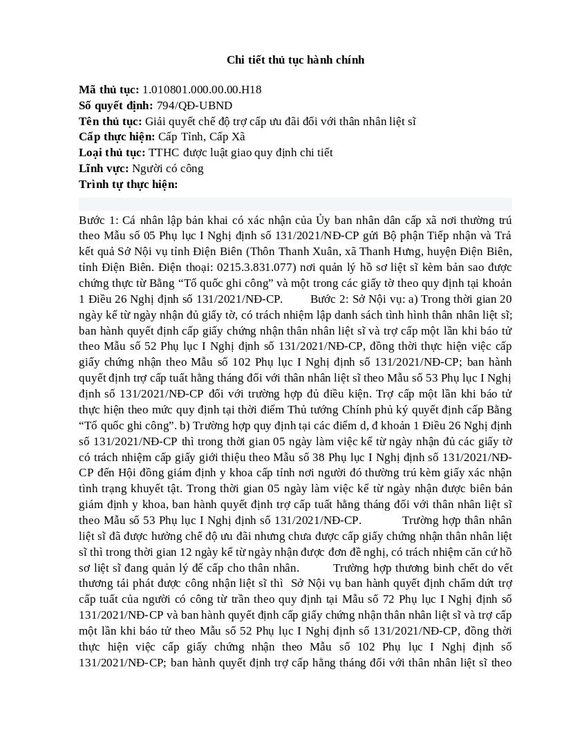 | Mô tả | Giải quyết chế độ trợ cấp ưu đãi đối với thân nhân liệt sĩCách thức thực hiện