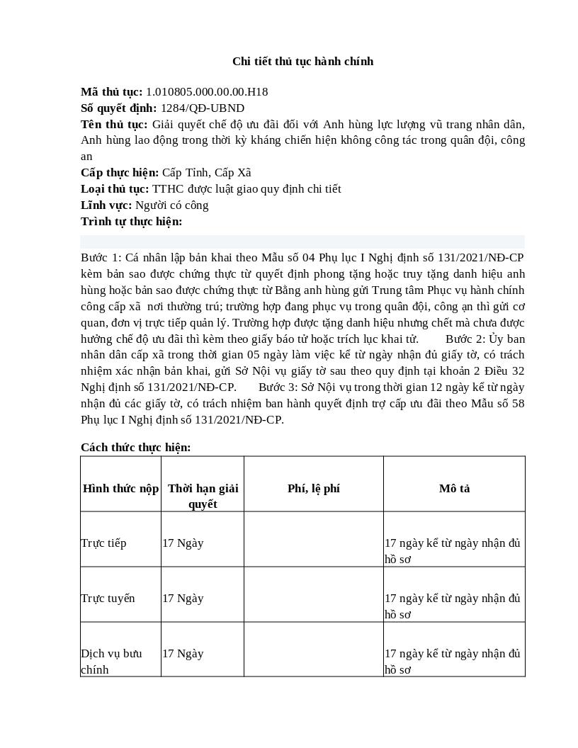 | Mô tả | Giải quyết chế độ ưu đãi đối với Anh hùng lực lượng vũ trang nhân dân, Anh hùng lao động trong thời kỳ kháng chiến hiện không công tác trong quân đội, công anCách thức thực hiện