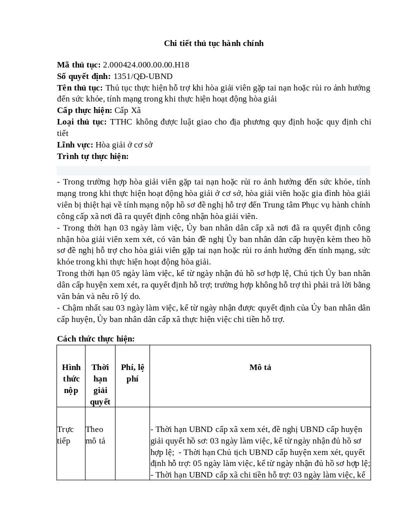 | Mô tả | Thủ tục thực hiện hỗ trợ khi hòa giải viên gặp tai nạn hoặc rủi ro ảnh hưởng đến sức khỏe, tính mạng trong khi thực hiện hoạt động hòa giảiXem chi tiết Cách thức thực hiện| Hình thức nộp | Thời hạn giải quyết | Phí, lệ phí | Mô tả |