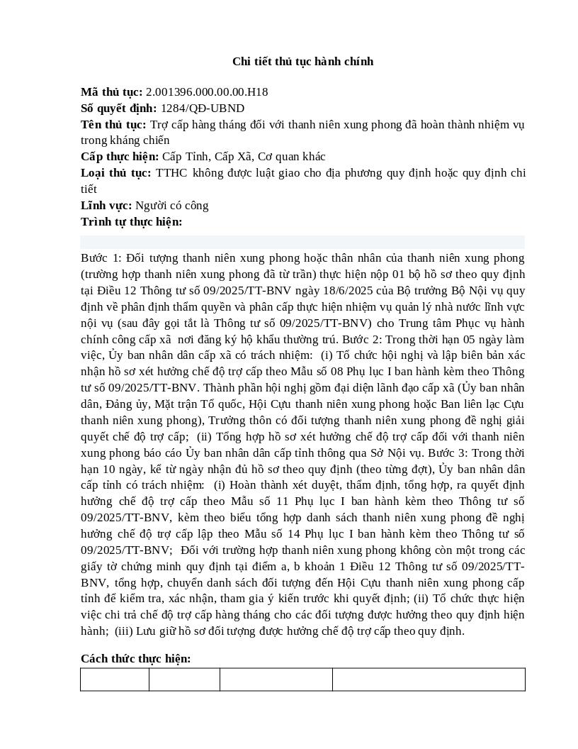 | Mô tả | Trợ cấp hàng tháng đối với thanh niên xung phong đã hoàn thành nhiệm vụ trong kháng chiếnCách thức thực hiện