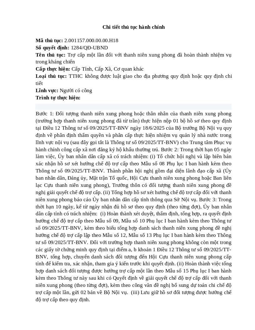 | Mô tả | Trợ cấp một lần đối với thanh niên xung phong đã hoàn thành nhiệm vụ trong kháng chiếnCách thức thực hiện